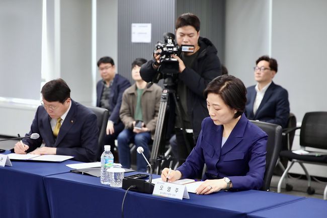 오영주 중소벤처기업부 장관이 지난 3월 10일 서울 중구 여신금융협회에서 열린 `소상공인 · 전통시장 소비촉진 활성화를 위한 업무협약식`에서 협약서에 서명하고 있다.
