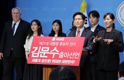 ▲김문수 전 노동부장관이 9일 서울 여의도 국회 소통관에서 대통령 선거 출마를 선언했다.