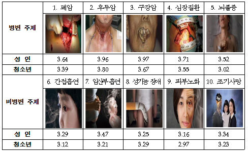 10종 그림별로는 흡연으로 인한 질병의 고통(환부)를 나타낸 주제(병변)가 아동, 임신부 등 대상별로 흡연의 폐해를 은유적으로 표현한 주제(비병변)보다 경고 효과가 더 높은 것으로 나타났는데, 이는 혐오도가 강할수록 각인효과로 인해 경고효과도 더 크게 나타난 것으로 보인다.