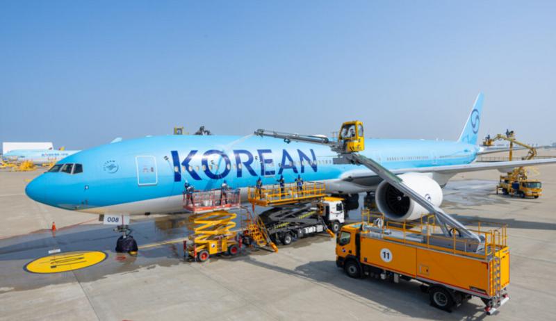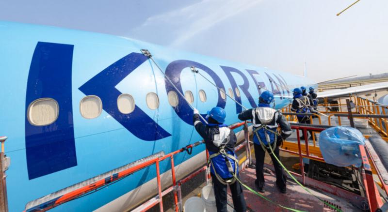 대한항공이 24일 인천 중구 정비 격납고 앞에서 봄맞이 항공기 동체 세척을 하고 있다.