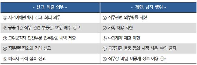 이 기준은 사적 이해관계자 신고, 직무관련 부동산 보유 신고, 고위공직자의 민간부문 업무활동 제출, 직무관련자와의 거래 신고, 퇴직자 접촉 신고 등의 5가지 신고·제출 의무와, 외부활동 제한, 가족 채용 제한, 수의계약 체결 제한, 공공기관 자산의 사적 사용 금지, 직무상 비밀 및 미공개 정보 이용 금지 등의 5가지 제한·금지 행위로 구성되어 있다.