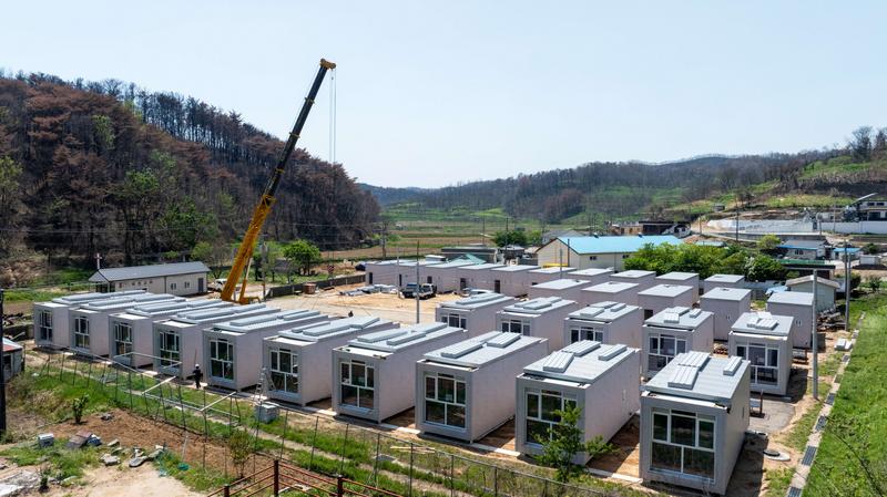 ▲올 3월 대형산불로 주거지를 잃은 이재민에게 공급할 경북 영덕군의 임시주택 제조 현장.