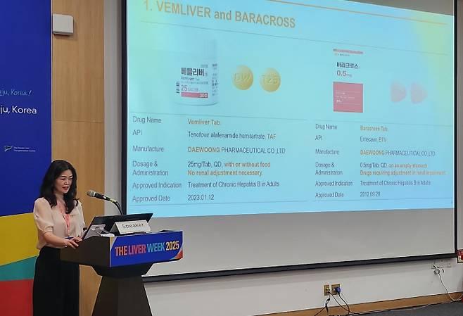 황은정 대웅제약 시판연구팀 파트장이 베믈리버의 4상 임상시험 배경을 설명하고 있다. (사진wprhd=대웅제약)