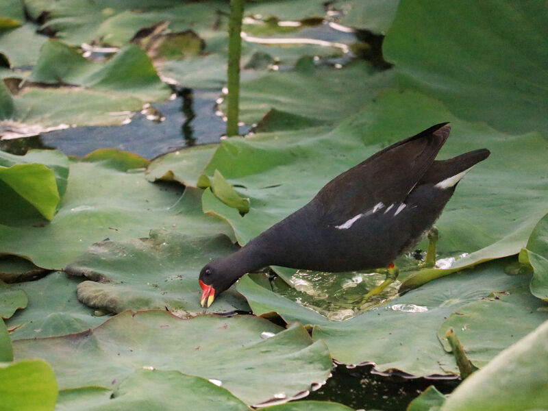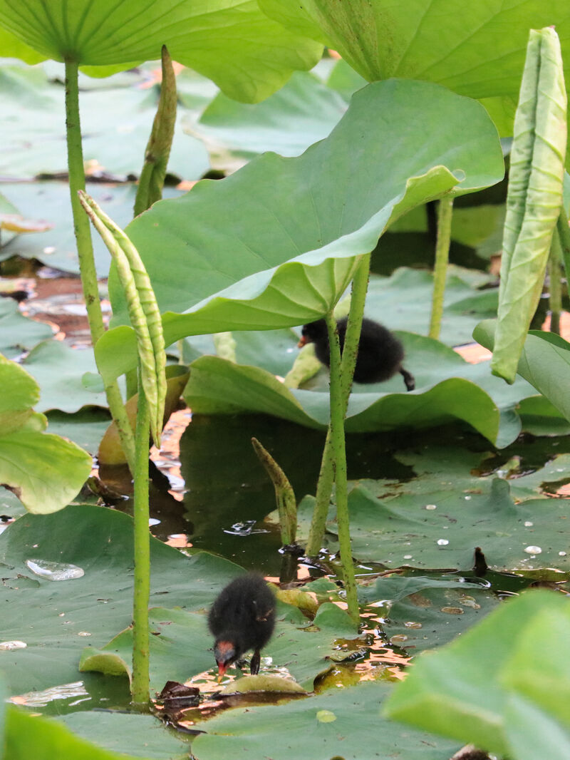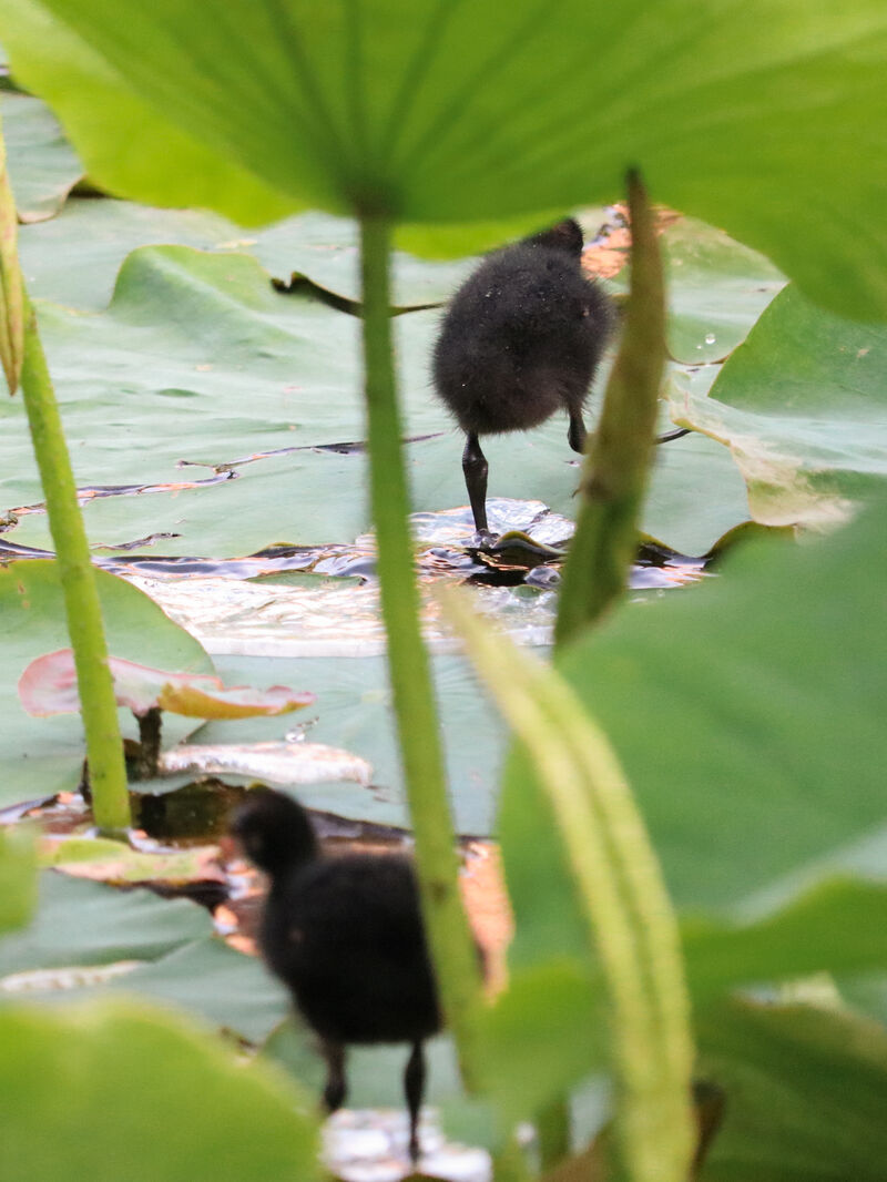 서울시 양천구 신정동 연의공원 저수지에서 쇠물닭이 새끼를 기르는 모습을 발견한 주민 이이은씨가 사진을 촬영했다. 촬영일시 2025년 6월 11일 오후 6시 경.