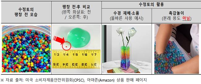 수정토는 물을 흡수해 수십 배 이상 팽창하는 고흡수성 폴리머 공으로, 수경재배·방향제·인테리어 소품 등으로 사용되지만 최근 유아용 촉감놀이로도 활용되는 사례가 늘고 있다. 그러나 물과 접촉해 원래 크기의 100배 이상 커지는 성질 때문에, 어린이가 삼킬 경우 체내에서 팽창해 위장관을 막는 등 위험이 크다.
