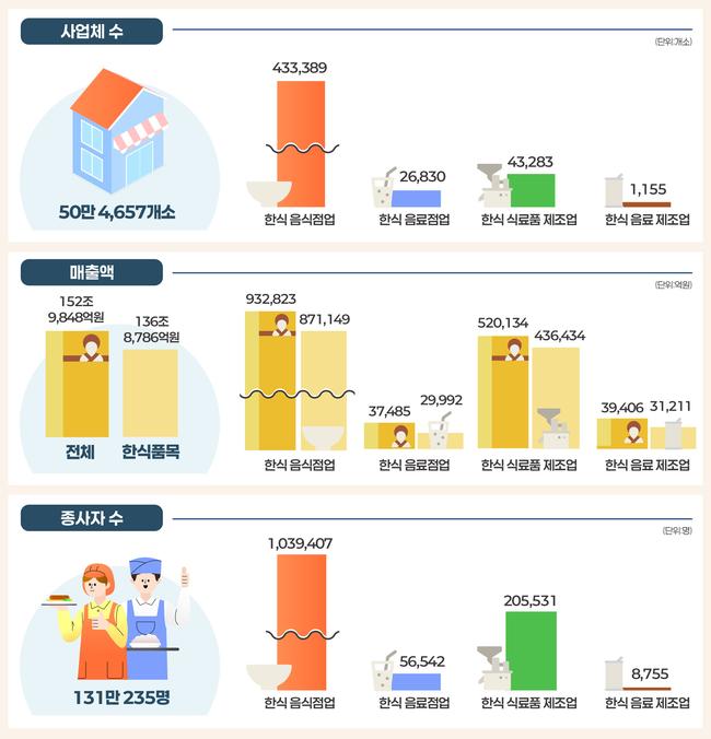 농림축산식품부와 한식진흥원은 2024년 한식산업 실태조사 결과를 통해 한식산업 총매출이 152조 9,848억 원에 이르고, 종사자는 130만 명에 달하며, 외식업은 감소하고 제조업은 성장세를 보였다고 밝혔다.