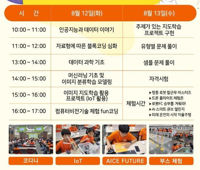 KT와 연계하여 진행되는 이 프로그램은 인공지능 이론 및 실습 교육과 함께 `모두를 위한 인공지능 자격(AICE, AI Certificate for Everyone)` 시험 기회를 제공한다. 특히 교육 후에는 자율주행 자동차, 로봇 축구, 드론 조종 등 다양한 체험 활동을 통해 학생들의 인공지능에 대한 흥미를 높일 수 있도록 설계되었다.