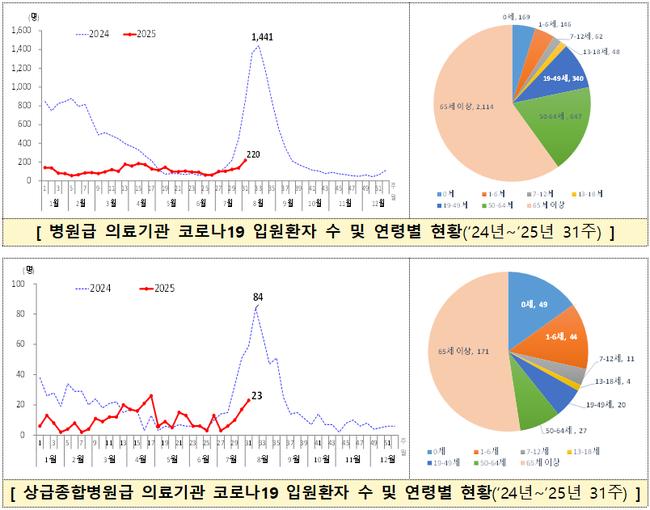 31주차(7월 27일~8월 2일) 병원급 의료기관(221개소) 코로나19 입원환자는 220명으로, 28주차 103명 대비 두 배 이상 늘며 5주 연속 증가세를 보였다. 연령별로는 65세 이상이 60.0%(2,114명)로 가장 많았고, 50~64세 18.3%(647명), 19~49세 9.6%(340명) 순이었다.