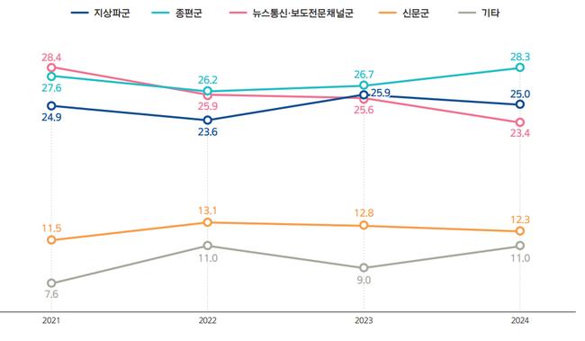 지상파군은 25.0%로 2021년(24.9%)과 유사한 수준을 유지하며 안정세를 보였다. 반면 뉴스통신·보도전문채널군은 23.4%로, 2021년 28.4%에서 크게 감소했다.