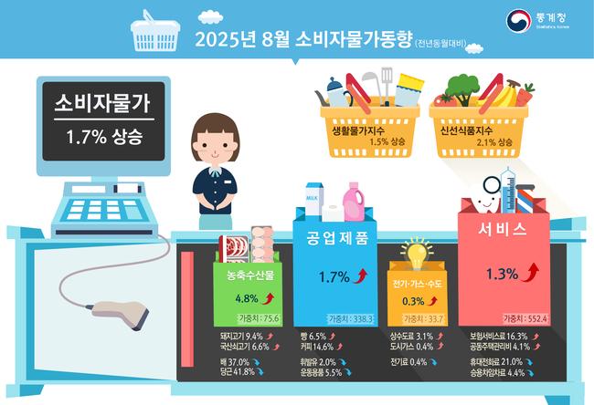 8월 소비자물가가 전년 같은 달보다 1.7% 오르며 두 달 연속 1%대 상승세를 이어갔다. 다만 전월 대비로는 서비스 가격 하락 영향으로 0.1% 내렸다.