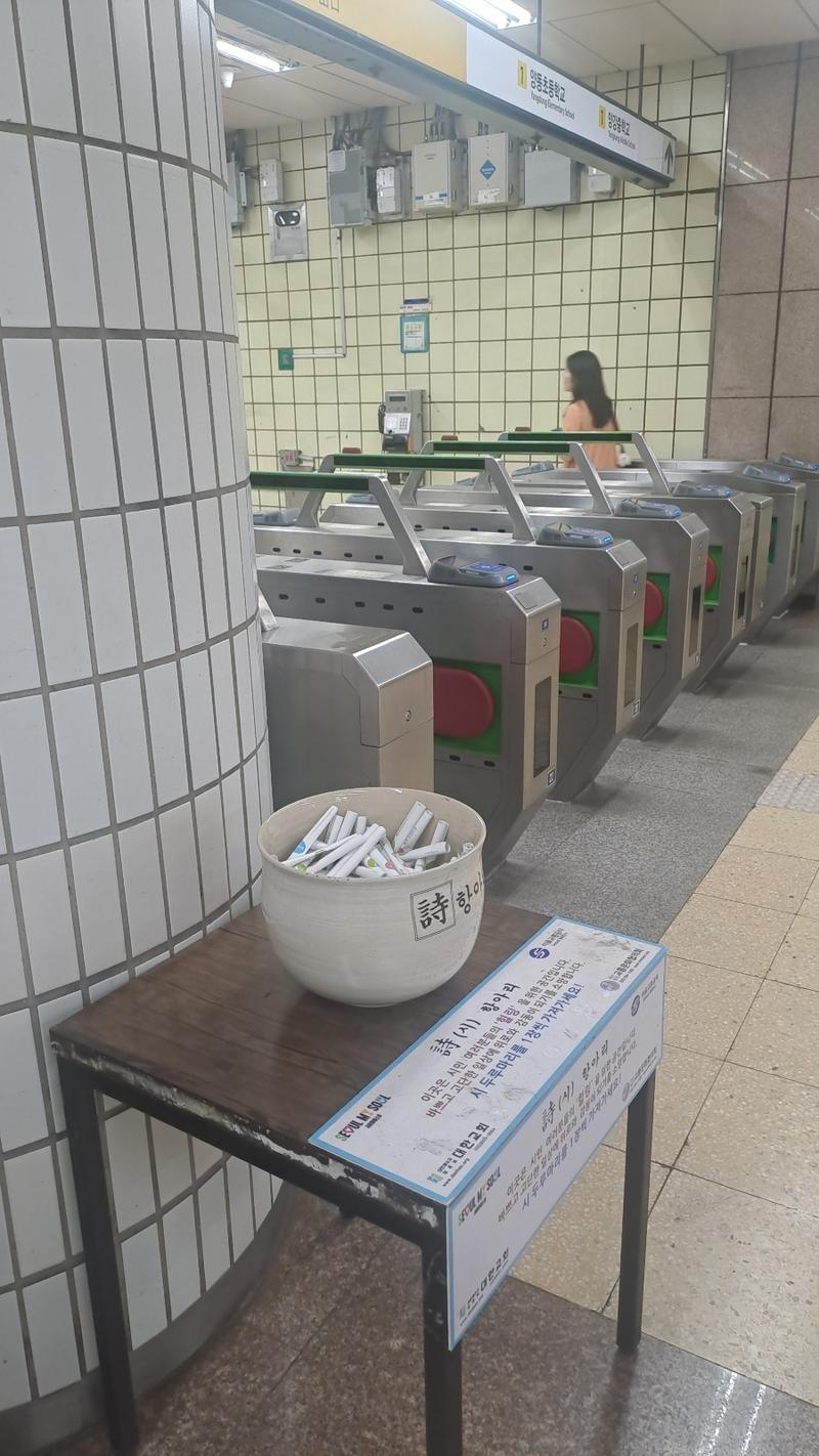서울시 지하철 5호선 신정역 1번, 4번, 5번 출구방향 개찰구 나가기 전 기둥 앞에 ‘詩(시) 항아리’가 놓여 있어 눈길을 끈다.