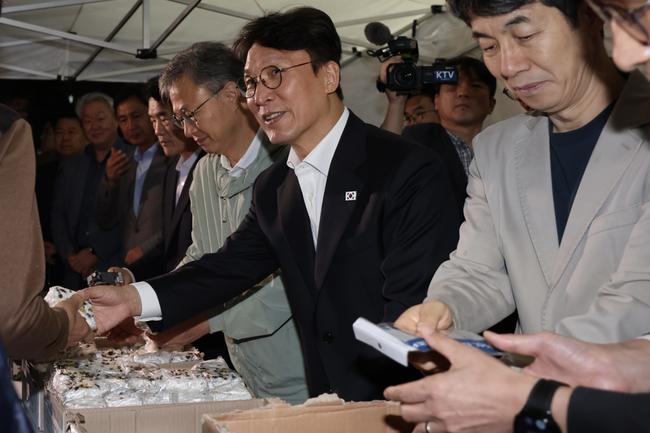 김민석 국무총리가 10일 구로구 남구로 새벽인력시장을 찾아 `종합지원 이동 상담버스`를 둘러보고 근로자들에게 떡을 나눠주고 있다.