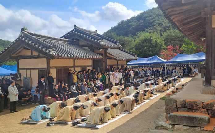 10월 25일 진성이씨 상계문중운영위원회가 개최한 경북 안동시 도산면 퇴계 종택 길사(吉祀)에서 제관들이 절을 하고있다.퇴계(退溪) 이황(李滉)의 17세손 이치억(李致億) 공주대 교수가 25일 퇴계 종손(宗孫)으로 공식 승계됐다.