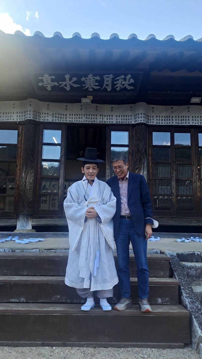 이치억(왼쪽) 퇴계 이황 종손이 고유를 마친 후 족친인 반창꼬뉴스 이창준 발행인의 축하를 받고 웃고 있다.