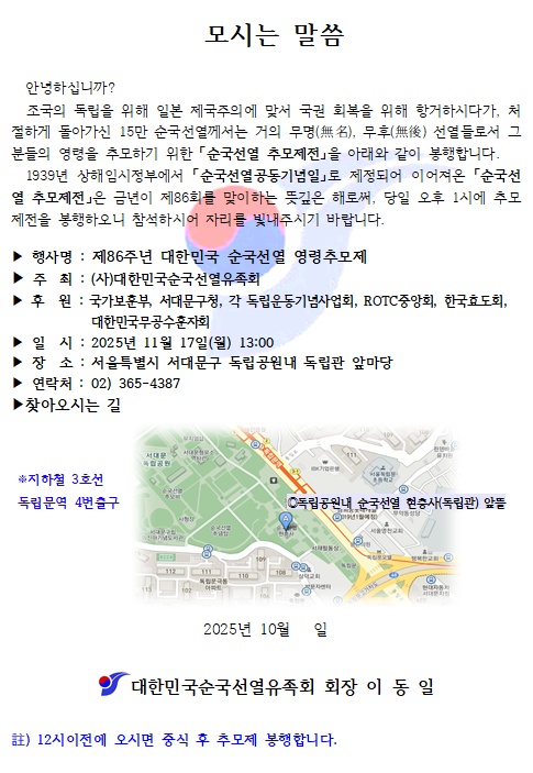 추모제는 17일(월요일) 오후 1시 서울시 서대문구 독립공원내 독립관 앞마당에서 열린다.