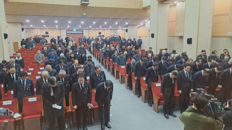 참석자들이 김영삼 대통령에게 절을 하고 있다.
