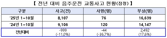 경찰청에에 따르면, 지속적인 음주운전 특별단속 및 집중 홍보, 음주 측정방해 행위(일명 술타기) 처벌 등의 영향으로 지난해에 보다 2025년 10월 31일 기준 음주 사고(-11.0%, 9,106건→8,107건) 및 사망자(-36.7%, 120명→76명)가 큰 폭으로 감소하고 있다.