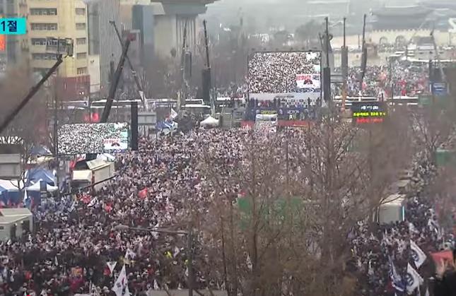 ▲1일 오후 5시경 세종대로 대한민국바로세우기국민운동본부 탄핵 반대 집회.(사진=SBS 캡처)