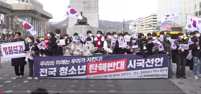 ▲10대 청소년들이 3일 오후 서울 종로구 광화문광장 이순신 동상 앞에서 ‘윤석열 대통령 탄핵반대 시국선언’을 하고 있다.(사진=뉴스핌TV 캡처)