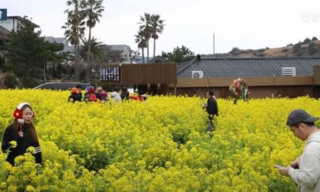 지난 주말(8~9일) 제주도 삼방산, 성산일출봉 일대 유채 꽃밭에 관광객들이 몰려들었다.