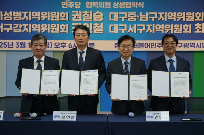 지난 14일, 두 의원은 대구시당에서 허소 대구시당 위원장(중·남구 지역위원장)과 함께 `협력의원단 상생협약식`을 개최했다. 이번 협약식은 더불어민주당 최규식 서구 지역위원장도 참석해 동서 화합의 의미를 더했다.