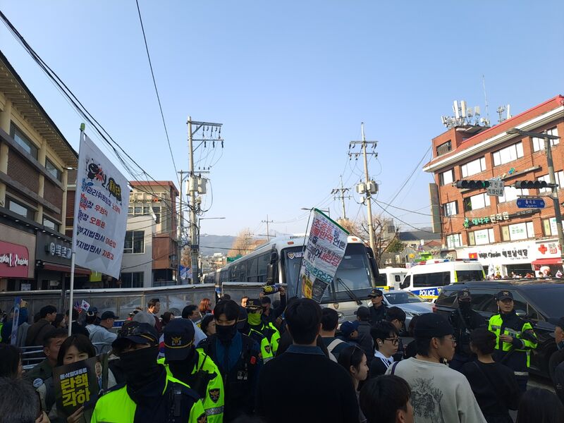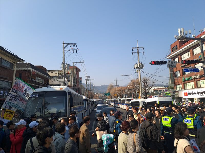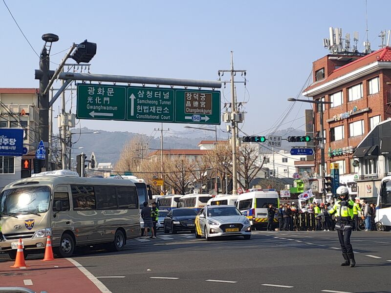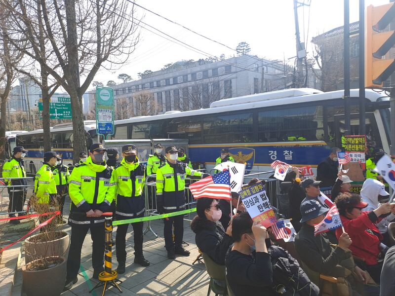 윤석열 대통령 탄핵 심판 선고를 앞둔 22일 오후 서울 종로구 헌법재판소 주변은 경찰 버스가 2중으로 가로 막는 등 철저히 통제되고 있었다.