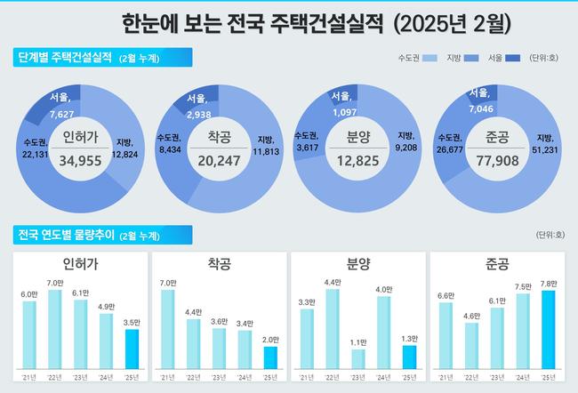 인허가 실적은 지역별로 엇갈렸다. 서울의 2월 인허가는 4,844호로 전년보다 97.6% 늘며 공급 기대감을 높였지만, 비수도권은 60.7% 줄어든 5,500호에 그치며 지역 간 양극화가 두드러졌다. 전체적으로는 2월 누적 기준 전국 인허가가 34,955호로 전년 동기 대비 6.5% 감소했다.