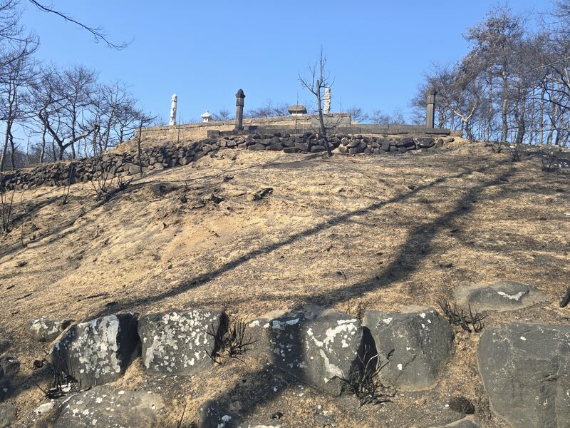▲산불로 인해 언덕 위 진성이씨 시조 이석의 묘도 전부 불에 그을렸다.