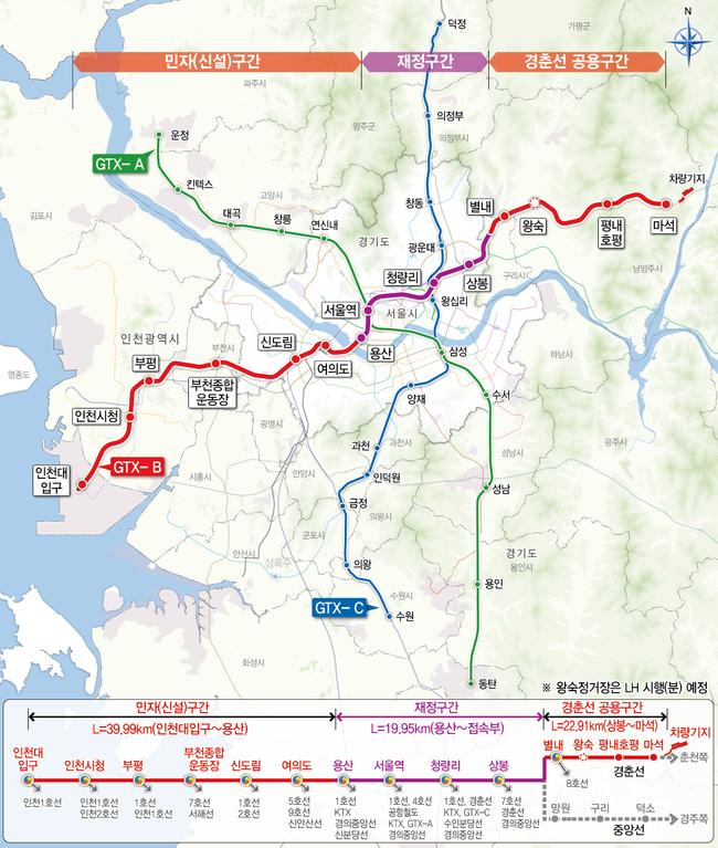 GTX-B 노선 중 민자구간은 인천대입구~용산 40km, 상봉마석 23km로 총 63km에 이르며, 총사업비는 4조 2,894억원(`20.12 불변가)이다.