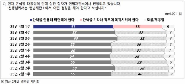 탄핵을 인용해 파면해야 한다 57% > 탄핵을 기각해 직무에 복귀시켜야 한다 35%
