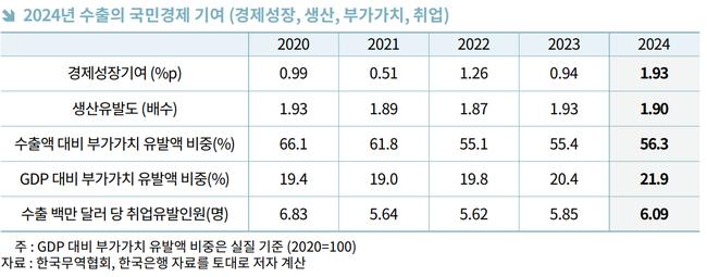 한국무역협회 유서경 수석연구원은 "수출의 높은 경제성장 기여도는 우리 경제가 수출 주도 성장 전략을 지속적으로 추진해야 함을 시사한다"면서, "수출의 경제적 파급효과를 확대하기 위해서는 수출 품목 다변화를 통한 장기적인 경쟁력 확보, 고부가가치 제품 개발, 중소기업의 글로벌 가치사슬 참여 확대 및 산업 생태계 강화 등의 노력이 필요하다"고 강조했다.