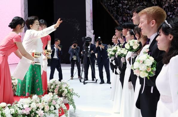 경기 가평 소재 청심평화월드센터에 신랑·신부 약 1,300쌍이 모이고 직접 오지 못한 이들이 있는 각국 현장을 온라인으로 연결한 가운데 결혼식이 진행됐다.
