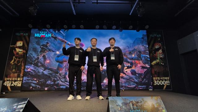 원스 휴먼 모바일 기자 간담회 현장(왼쪽부터 김일 한국 마케팅 매니저, 지오위 수석 게임 디자이너, 이세영 한국홍보 총괄이사)