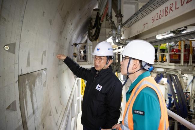 박상우 국토교통부 장관이 지난 4월 15일 오전 김포~파주 한강터널 건설현장을 방문해 공사 진행상황을 점검하고 현장 안전확보방안, 첨단기술을 활용한 안전관리 실태 등을 확인하고 있다.이번 점검은 대형 공동구 9곳을 대상으로 진행되는 특별 점검의 일환으로, 도시 기능 유지에 필수적인 공동구의 안전 관리 실태를 꼼꼼히 확인하기 위해 마련됐다.