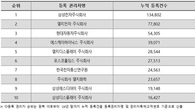 국내 최다 특허권자는 삼성전자… 상표권 1위는 아모레퍼시픽