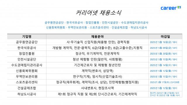 취업 포털 커리어넷이 8일 공무원연금공단, 한국석유공사, 창업진흥원, 인천시설공단 등 주요 공공기관 및 공기업의 2025년 상반기 채용 소식을 발표했다.