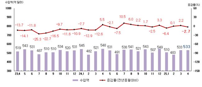 수입은 기계류(7.9%)·석유제품(0.7%)·조제식품(2.9%) 등이 증가했으며, 원유(△19.9%)·메모리 반도체(△8.7%)·승용차(△2.8%) 등은 줄었다. 소비재 수입은 소폭 감소(△2.1%)했고, 자본재는 8.7% 증가하며 제조용 장비(31.7%)와 정밀기기(8.6%) 등의 수요가 증가한 것으로 나타났다.
