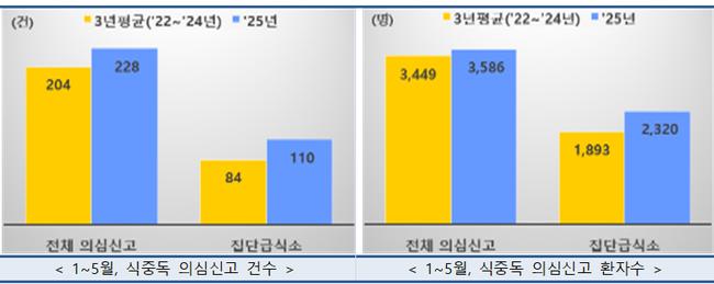 올해 5월 둘째 주까지 집단급식소 식중독 의심신고는 총 110건으로 최근 3년 평균(84건) 대비 31% 증가했으며, 이 중 약 48%는 학교 급식에서 발생했다. 특히 5~6월에는 살모넬라, 병원성 대장균, 캠필로박터 제주니 등에 의한 세균성 식중독이 빈번히 발생하는 시기다.