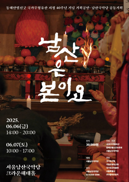 서울남산국악당-동해안별신굿보존회 공동기획공연 ‘동해안별신굿: 남산은 본이요’ 포스터.서울남산국악당과 동해안별신굿보존회가 공동기획한 전통예술 공연 ‘동해안별신굿: 남산은 본이요’가 오는 6월 6일과 7일 이틀간 서울남산국악당 크라운해태홀에서 열린다.
