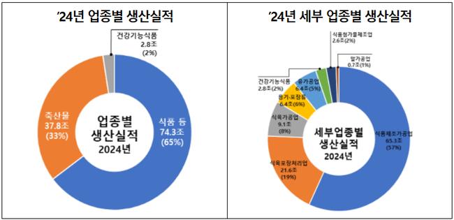 식품산업 생산은 국내 제조업 총생산의 16.8%를 차지하며 꾸준한 성장세를 유지하고 있다. 업종별로는 식품 및 식품첨가물, 용기포장 등을 포함한 일반 식품이 74조 2,920억 원(64.7%)으로 가장 큰 비중을 차지했고, 축산물이 37조 7,714억 원(32.9%), 건강기능식품이 2조 7,618억 원(2.4%) 순이었다.