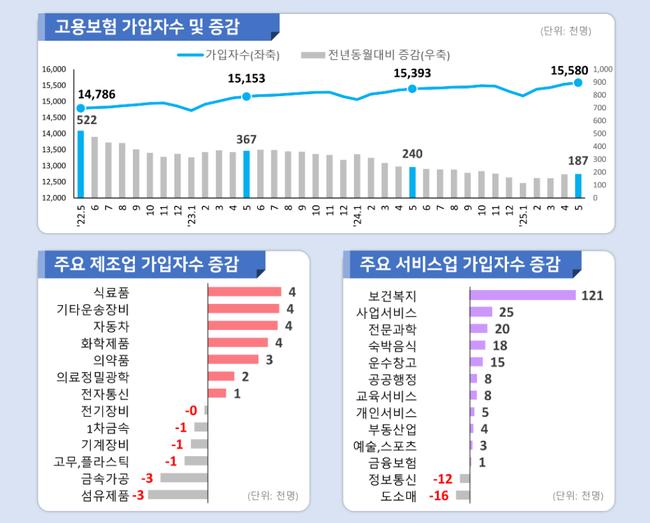 2025년 5월 말 기준 고용보험 상시가입자가 1,558만 명을 기록하며 전년 동월 대비 18만 7천 명(1.2%) 증가했다. 이는 고용행정 통계에 기반한 수치로, 서비스업이 전체 가입자 증가세를 주도한 것으로 나타났다.