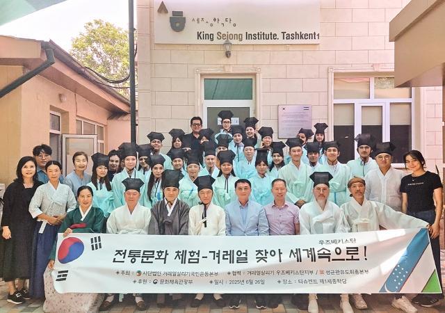 ▲지난 6월 26일 우즈베키스탄 타슈켄트 제1세종학당에서 ‘2025 겨레얼 찾아 세계속으로' 행사 후 참석자들이 기념촬영을 하고 있다.(겨레얼살리기국민운동본부 제공)