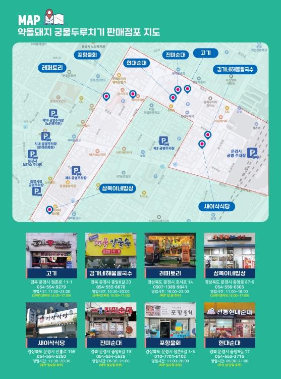 경상북도 문경시가 약돌돼지특화거리조성사업의 일환으로 점촌점빵길(문경중앙시장, 행복상점가, 점촌역전상점가)에 약돌돼지궁물두루치기 메뉴를 개발하여 판매한다.