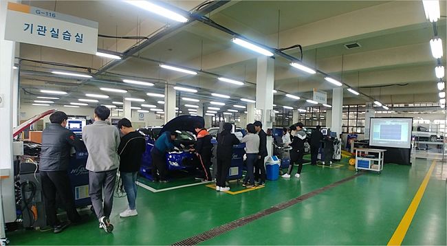 한국폴리텍대학 강릉캠퍼스 스마트자동차과에서 자동차 공조장치 성능 점검 실습을 진행하는 모습