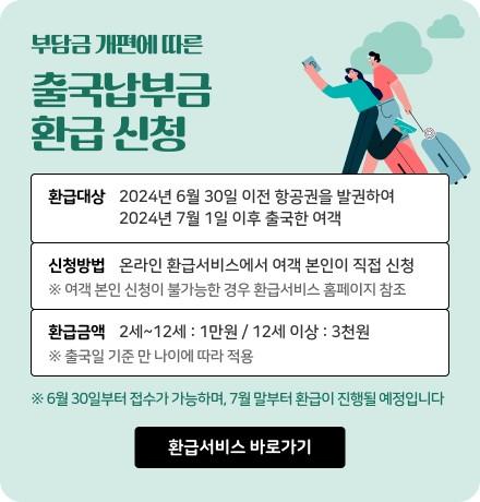 환급대상은 2024년 6월 30일 이전 항공권을 발권해 2024년 7월 1일 이후 국내 공항을 통해 출국한 여객이며, 환급금액은 2세∼12세는 1만원, 12세 이상은 3천원이다.