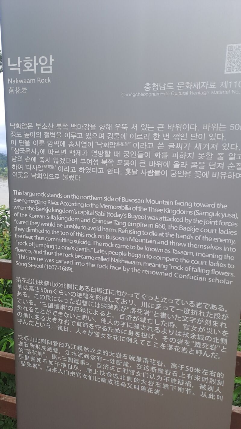 사진은 충청남도 부여군 부소산 북쪽 백마강(금강) 변 바위 절벽인 낙화암 전망대에서 촬영했다. 바로 위 사진은 전망대 안내판에 있는 낙화암 전경을 재촬영한 것이다.