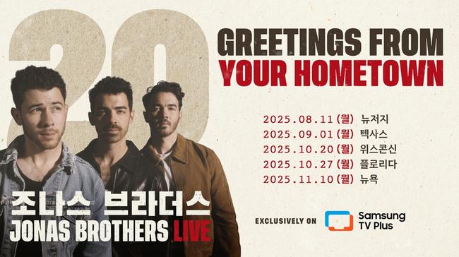 삼성 TV 플러스를 통해 세계적인 팝 밴드 조나스 브라더스(Jonas Brothers)의 데뷔 20주년 기념 콘서트 `JONAS 20: Greetings from Your Hometown` 투어를 생중계로 볼 수 있다.