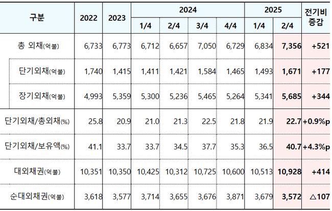 한국은행이 20일 발표한 ‘2025년 2분기 대외채권·채무 동향’에 따르면, 단기외채(만기 1년 이하)는 1,671억달러로 1분기보다 177억달러 늘었고, 장기외채(만기 1년 초과)는 5,685억달러로 344억달러 증가했다.