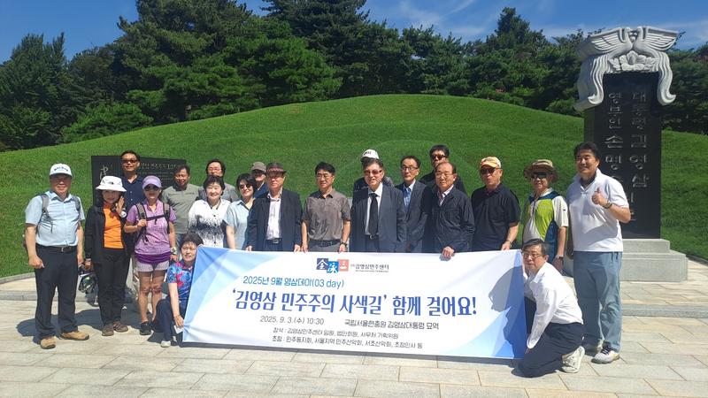 김덕룡 김영삼민주센터 이사장(앞줄 오른쪽에서 다섯번째)이 3일 서울 동작구 국립서울현충원 김영삼대통령 묘역에서 ‘김영삼 민주주의 사색길’ 산행 참가자들과 기념촬영.