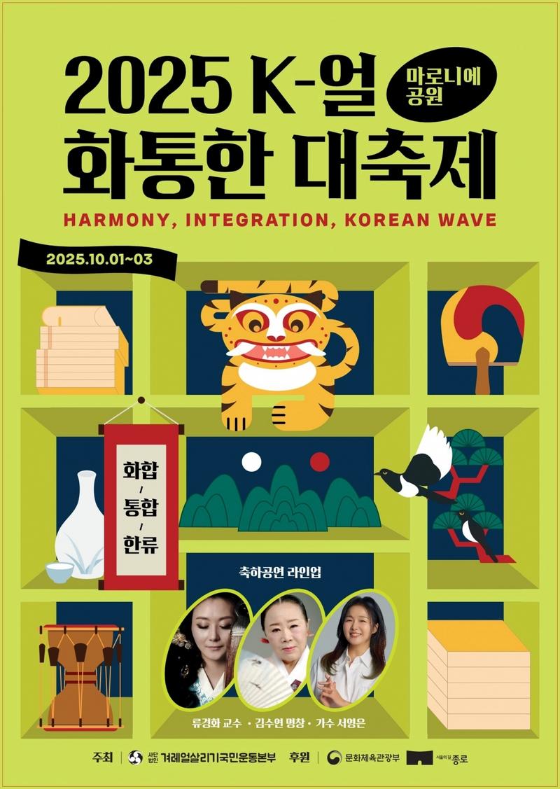사단법인 겨레얼살리기국민운동본부(이사장 이권재)는 오는 10월 1일부터~ 3일까지 서울시 종로구 마로니에공원에서 '2025 제3회 겨레얼살리기 화통한(和統韓) 대축제(이하 대축제)'를 개최한다.